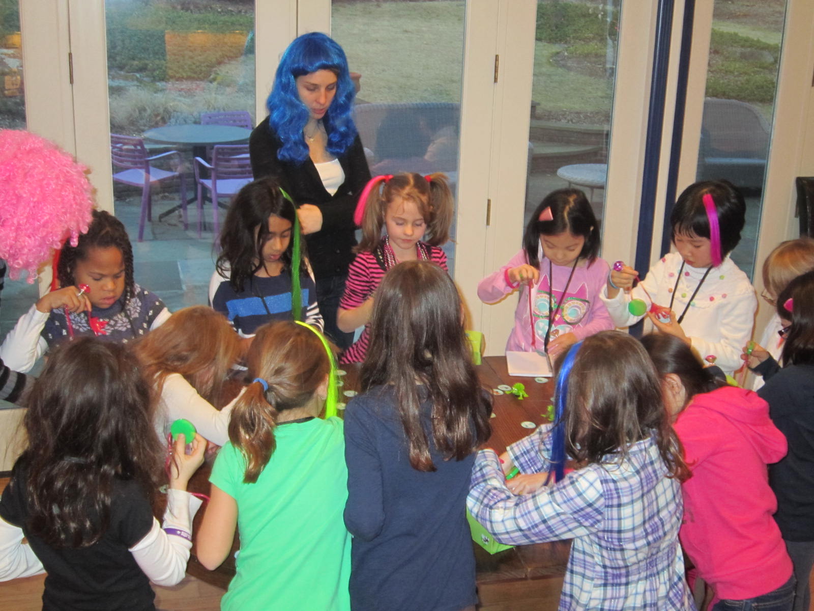 In each girl’s School Registration packet there was a folder that included a notepad, pen, a Fearbook (yearbook), their class photo, a student i.d. and a class schedule. The website for Monster High has an application where you can import your own photo and it will merge with a “monster student” in order to create a student i.d. I used my daughter’s school class picture in order to cut-out and paste each of her friends’ faces into this student i.d. The application also generated the students new monster name. I printed out an i.d. for each guest, laminated it and put it on a lanyard so they could wear their student i.d.’s around their neck. I also used these pictures to create the “Fearbook” (yearbook), so that they would all have a booklet of what all their friends looked like as student monsters. My daughter dressed up like one of the Monster High characters (Draculaura), my sons dressed in monster shirts, and we gave each of the girls brightly colored hair extensions that we clipped into their hair. I had the “teachers” wear wigs.