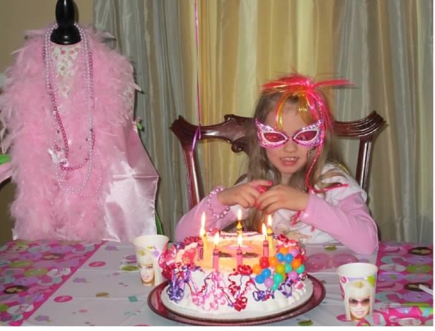 And finally for Adornments (which are those extra touches), we had purchased colored hair extensions that we put in their hair which they were able to keep and take home. We also dressed my daughter’s brothers up to look like Fashion Ken dolls. For the Fashion Show we had disco lights flashing. For the party gift, we gave each of the girls an illustrated book of the history of Barbie’s fashion throughout the years. And finally we used one of our activities as an adornment during the cake celebration, by moving the mannequin the girls had created an