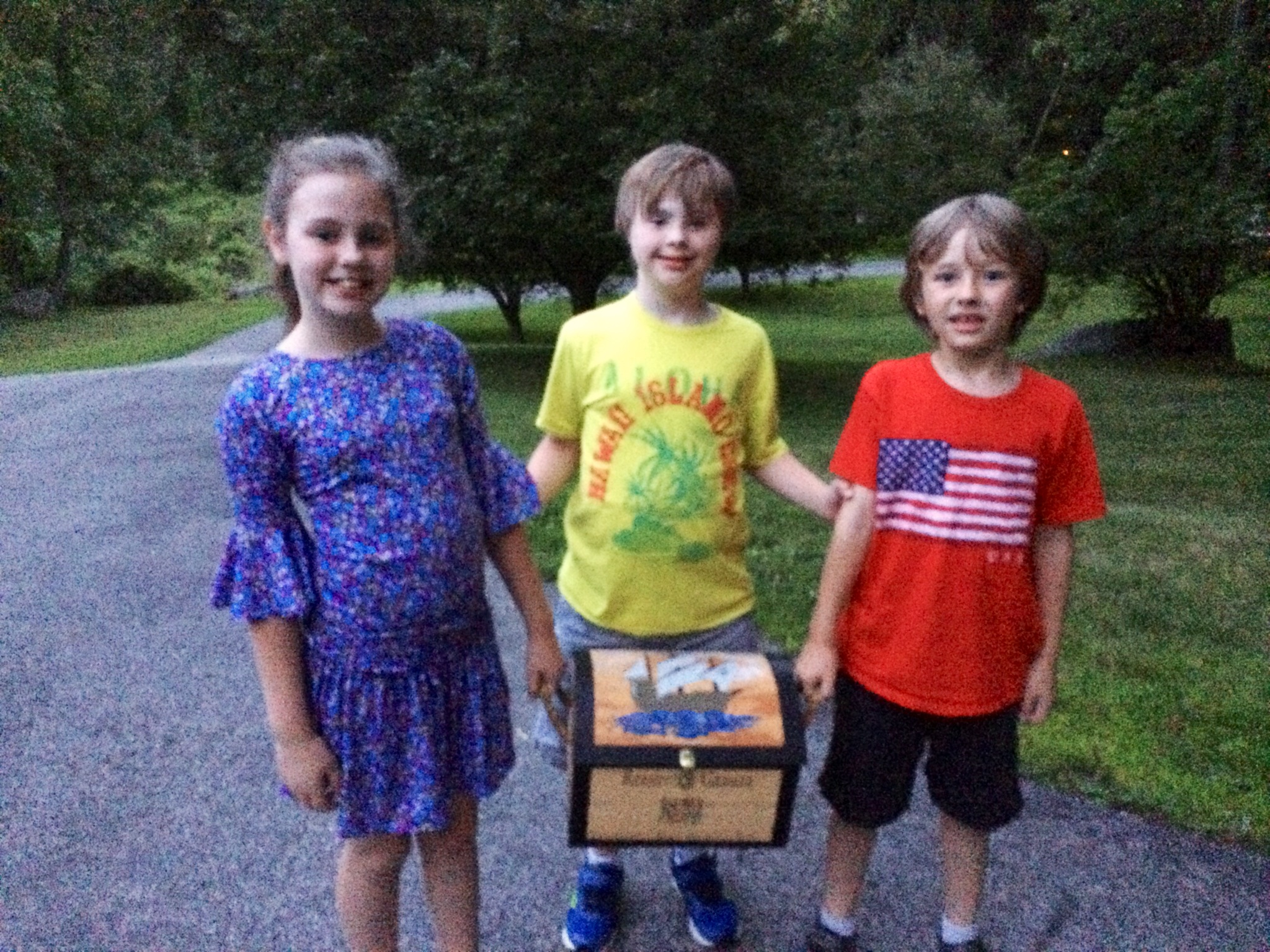 The second treasure hunt had real “treasure” at the end. I had stopped by our local toy store earlier in the day and picked up a few fun items for the treasure chest, like kids’ playing cards, scratch-and-sniff stickers, and zombies whose eyes and brains popped-out of their heads when you squeezed them. I made sure I bought three slightly different, but same type of toy for each of my children so that the fun of the game didn’t end up in fighting over the prizes.