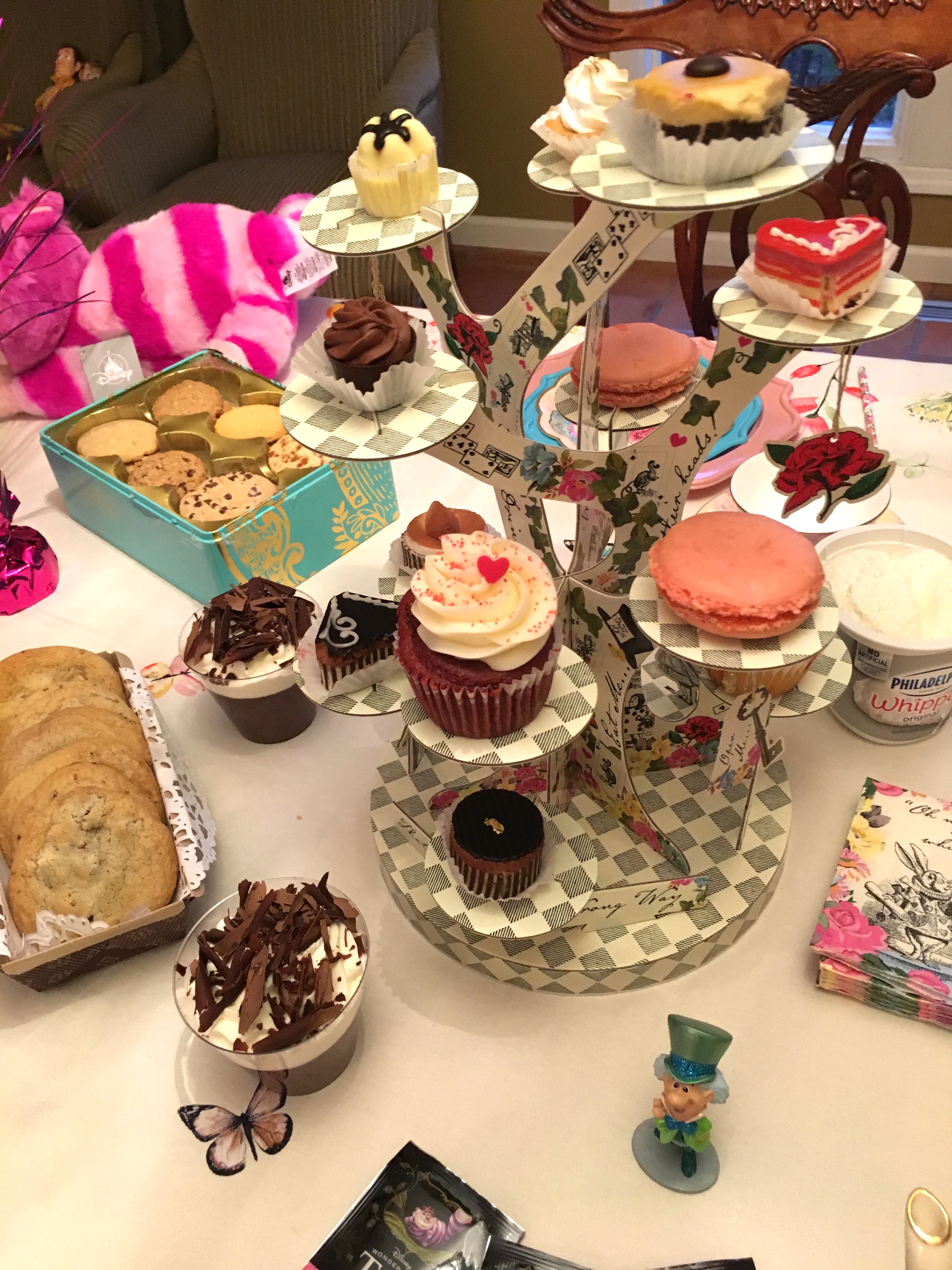 For the Ambiance, the obvious choice in the middle of winter was to hold it inside in our dining room. I covered our dining room table with a flowered, spring-like table cloth and purchased some Alice in Wonderland wall decorations on-line. I also purchased a beautiful tea set that doubled as a birthday gift for my daughter. The table was covered with tea party food, some of which were displayed on tiered dessert towers. I used decorative flowered paper-plates and set them on top of plastic colored-plates in different sizes to create a more elegant setting.